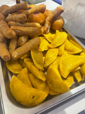 20 beef empanadas, 10 Colombian cheese sticks, 10 pastel de yuca, Colombian red beans and cabbage slaw. Serves 10.